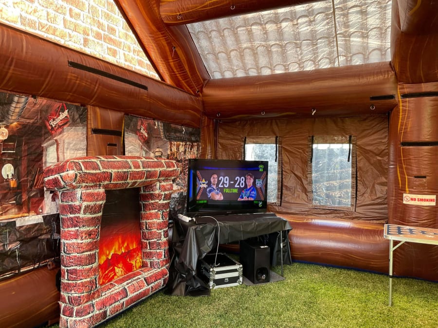Designed particularly for the Australian market we have air outlet valves to keep air flowing through the Inflatable Pub, inflatable eskys in each corner, a life like style bar painted on the wall along with inflatable fake TV screens with sports scenes. Care: Extras such as the bar, TV etc shown in some of the pics can be hired from Walkers Party Hire. You are booking the inflatable pub only.