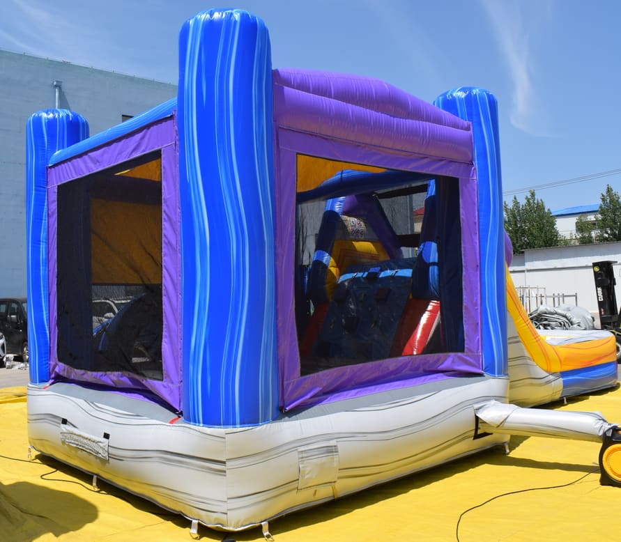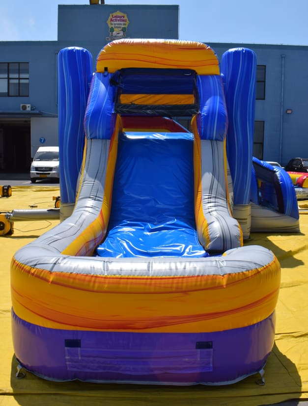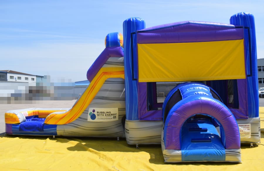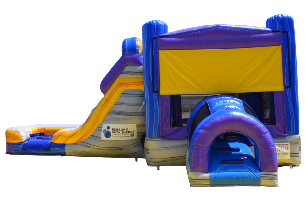 The Jumping Castle Wet Dry Combo has a slide, bouncer, hoops, pop up obstacles and a ladder. It's a wet/dry slide so it can be used all year round. There is so much to do on this combo castle that it will keep the patrons happy for hours.