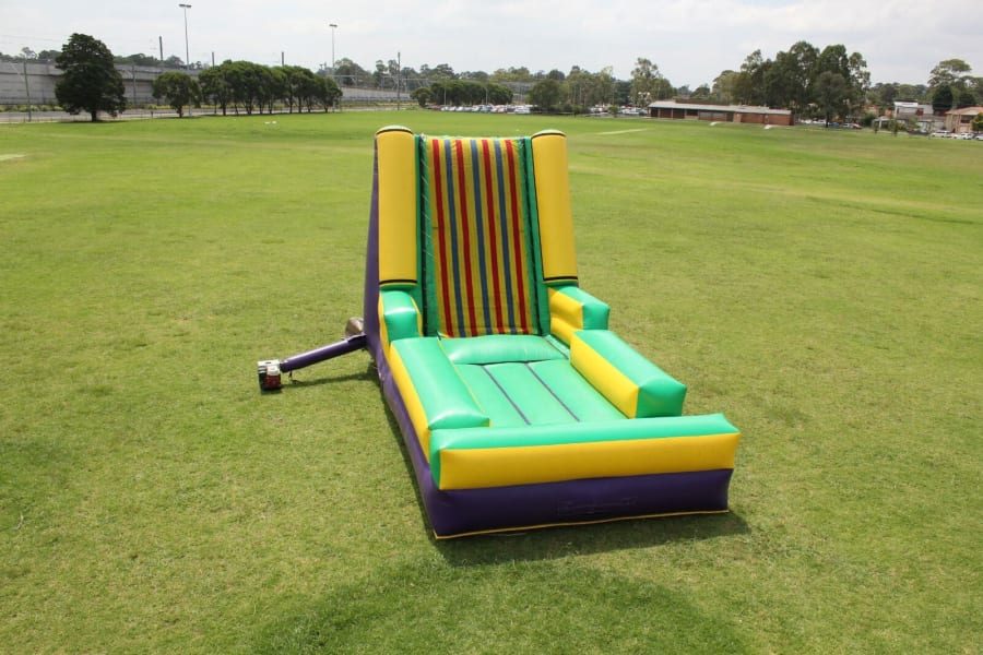 This is a modernised version of the popular human fly wall (AKA sticky velcro wall). This re-vamped version has barriers for extra safety, a runway and a bouncy launch pad for takeoff. The Human Fly Wall hire also includes 6 Velcro suits of various sizes.