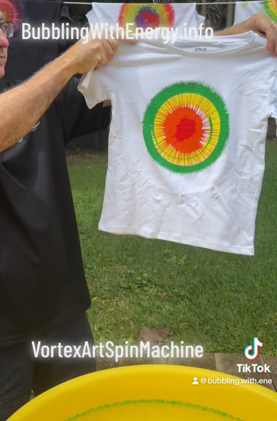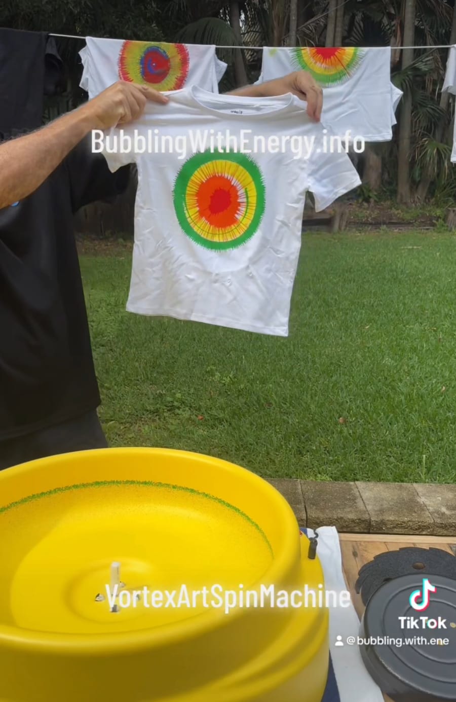 The Vortex Art Spin Pro T-shirt printing machine, sometimes called a spinning T-Shirt maker, allows you to create your own colourful T-shirt. You simply place a plain coloured T-shirt in the centre disc of the machine and add colours to it. As the machine spins between each colour addition, a brilliant picture emerges. The premium water based acrylic paints used are non toxic and non acidic.