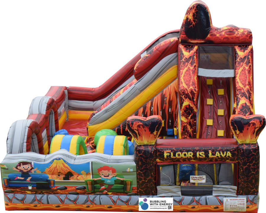 The Floor is Lava Combo is an inflatable jumping castle with a bouncer, pop ups, tunnels, ladder and slide.