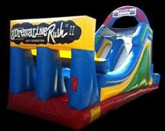 The challenges just keep coming as two participants enter through the openings in either side and proceed through a series of obstacles, over rock climbs and down a slide. It's an exciting course for your backyard party, fund raising event, school fun day, or sports club gala.