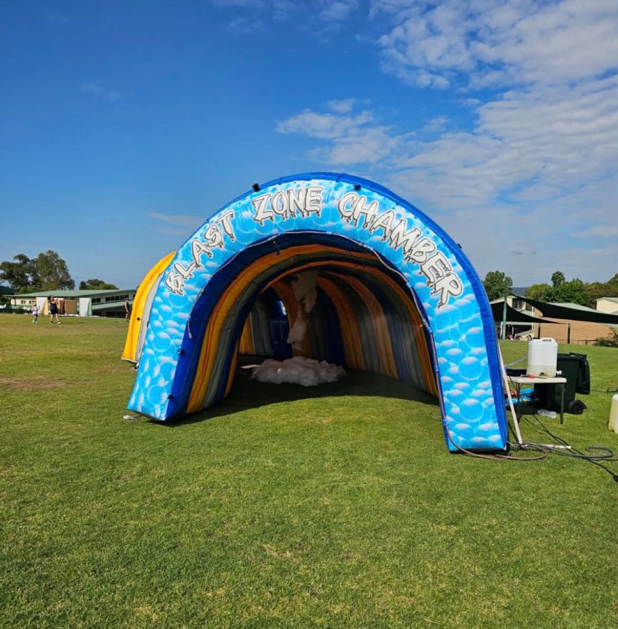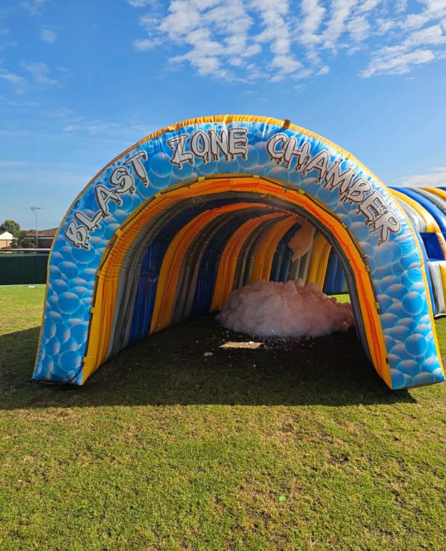 As participants pass through the Blast Zone Foam Chamber inflatable tunnel they are blasted with non toxic foam. It's a great addition to a fun run, colour run, or obstacle course tournament, and is a unique attraction for a foam party, fete or festival or fund raiser. Alternatively, rather than foam we can blast a mist of air through the chamber.