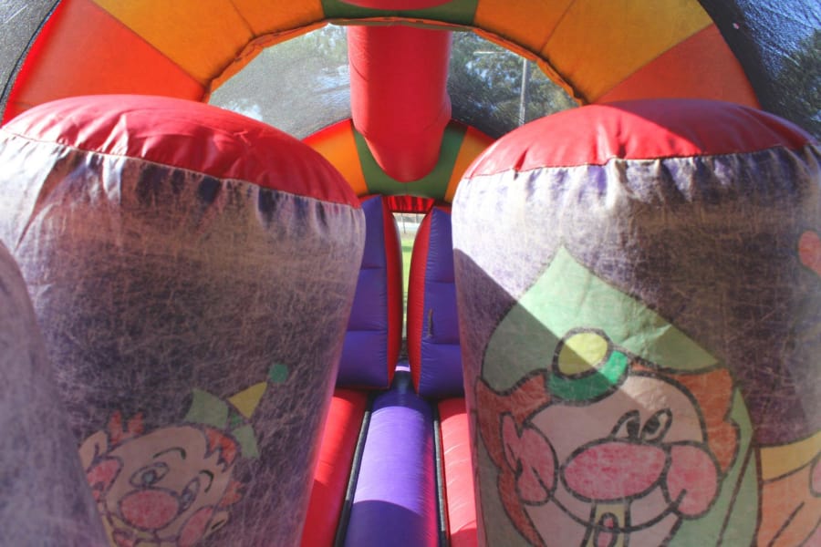 The mobile Circus inflatable obstacle course is a spectacular attraction for any event. It has two lanes that traverse through stairs, down the slide, through the obstacles, popups, hurdles, and out through the mesh to the finish line.